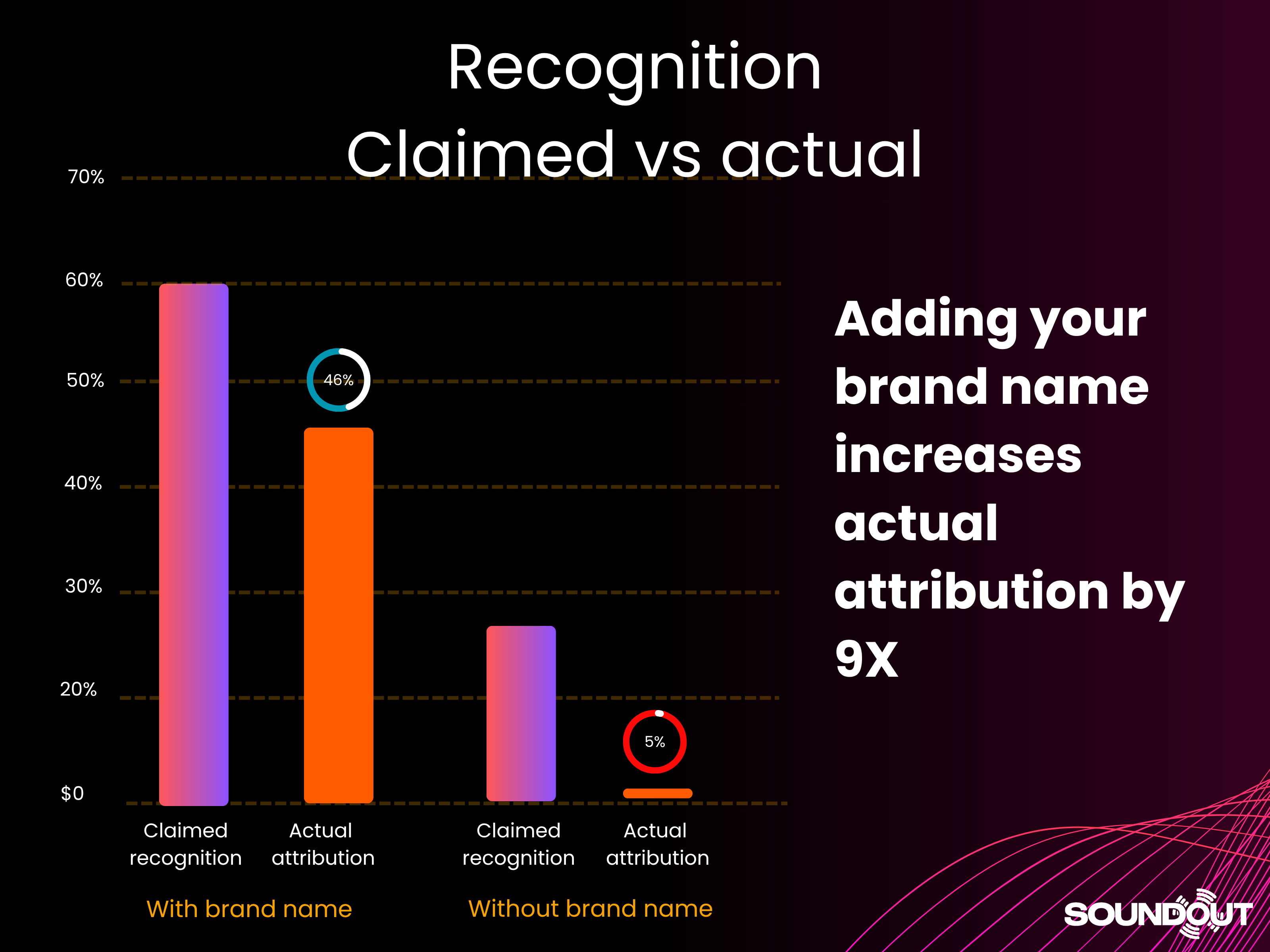 The brand name advantage: 22 of the top 25 sonic logos include the brand name. Logos that include the name are 9 times more effective at driving actual attribution than pure musical cues. By contrast, 90 of the bottom 100 omit the brand name.