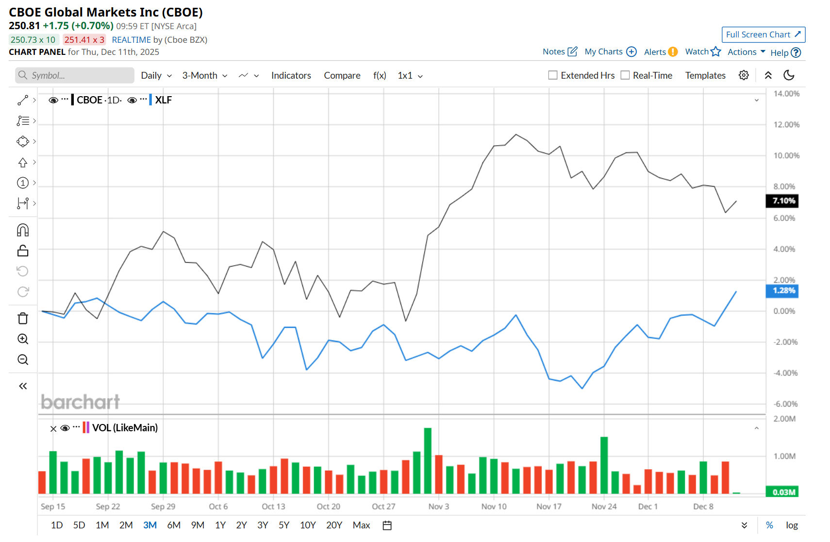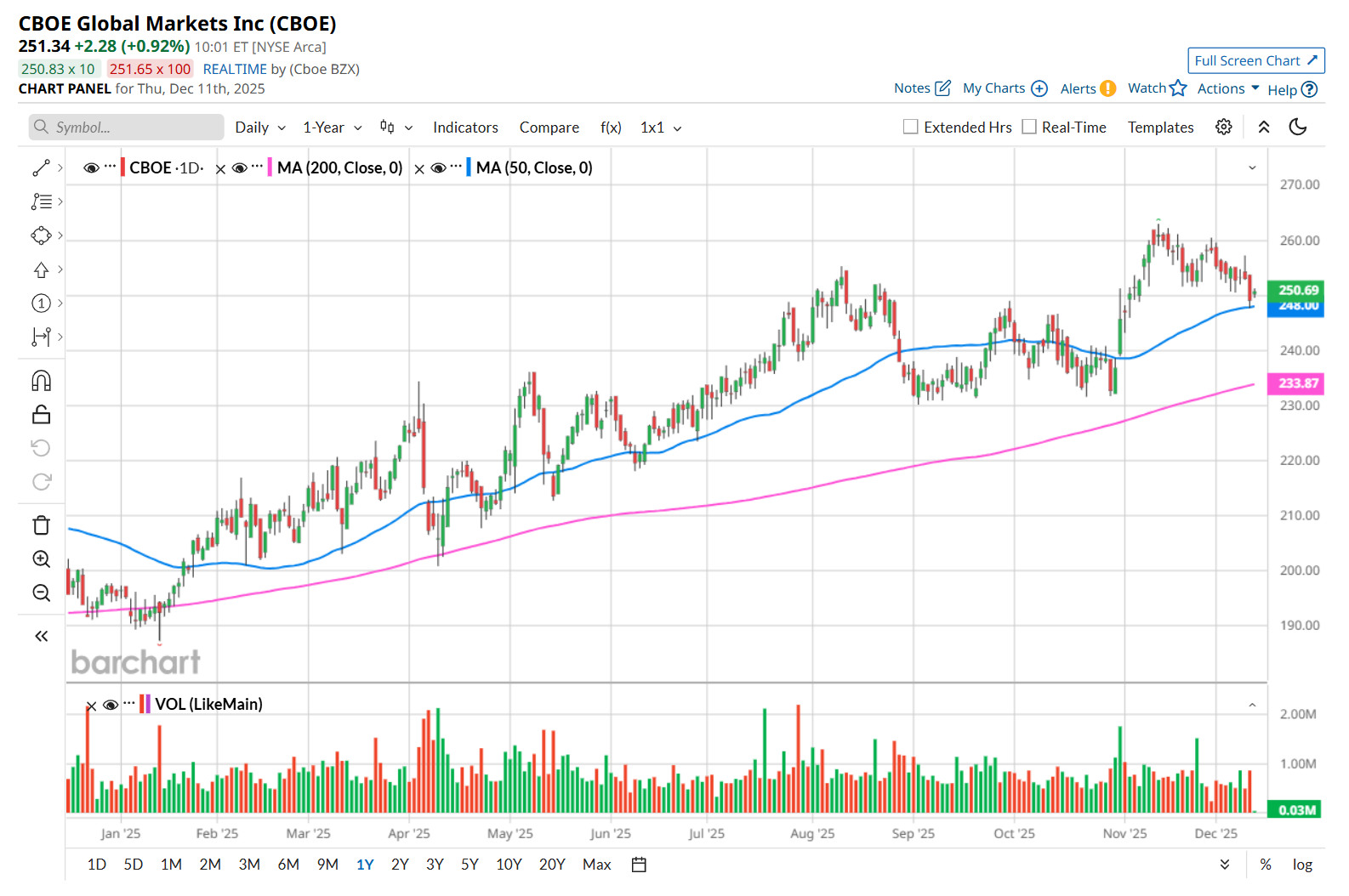 To confirm its bullish trend, CBOE has been trading above its 200-day moving average over the past year, with minor fluctuations, and has remained above its 50-day moving average since late October.