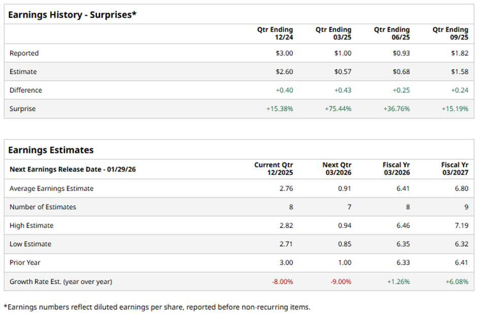 The Goleta, California-based company is expected to announce its fiscal Q3 2026 results soon. Ahead of this event, analysts predict DECK to post an EPS of $2.76, down 8% from $3 in the year-ago quarter. However, it has surpassed Wall Street's earnings estimates in the last four quarters.