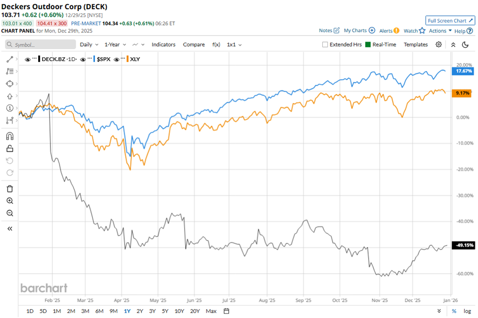 Shares of Deckers Outdoor have decreased 49.9% over the past 52 weeks, lagging behind both the S&P 500 Index's ($SPX16.9% gain and the State Street Consumer Discretionary Select Sector SPDR ETF's (XLY5.2% return over the period.