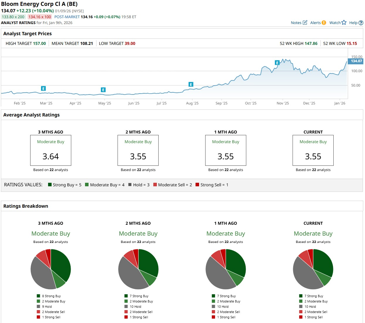 Sentiment around BE stock reflects that bigger picture. The 22 analysts covering Bloom Energy collectively land on a consensus rating of “Moderate Buy,” signaling a generally constructive stance. The average price target sits at $106.20, which actually represents 24% potential downside from the current price. That's a reminder that BE stock has already run hard.