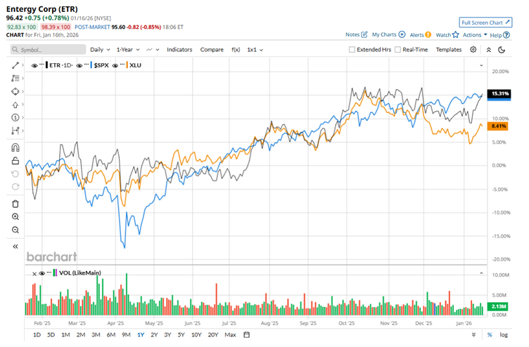 ETR stock delivered a solid showing in 2025, climbing 18.6% and comfortably outperforming both the broader S&P 500 Index’s ($SPX) 16.9% rise and the Utilities Select Sector SPDR Fund’s (XLU) 10.2% return over the same period, highlighting its relative strength in a steady but competitive sector.