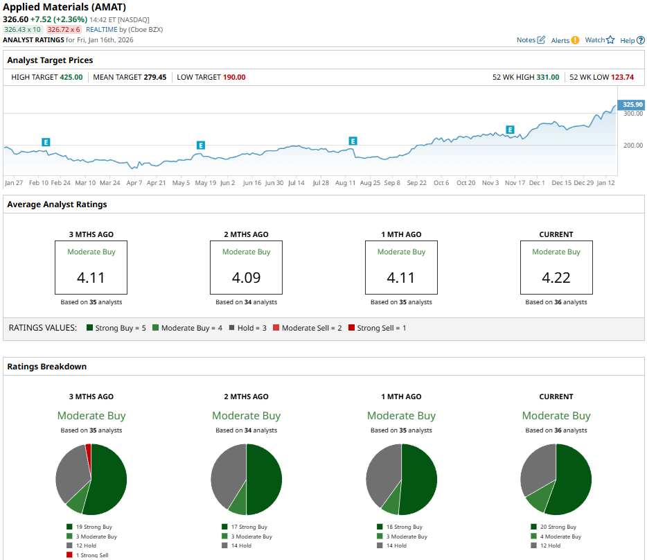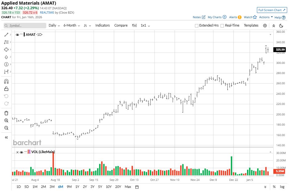 AMAT stock is up sharply amid semiconductor strength, hitting a 52-week high of $331 on Jan. 15 after a 167% rise from $124 lows in July 2025. AMAT has gained almost 9% in the last five days, 26% in one month, 68% over six months, and 75% over 52 weeks, trading above 50-day and 200-day moving averages (MAs).
