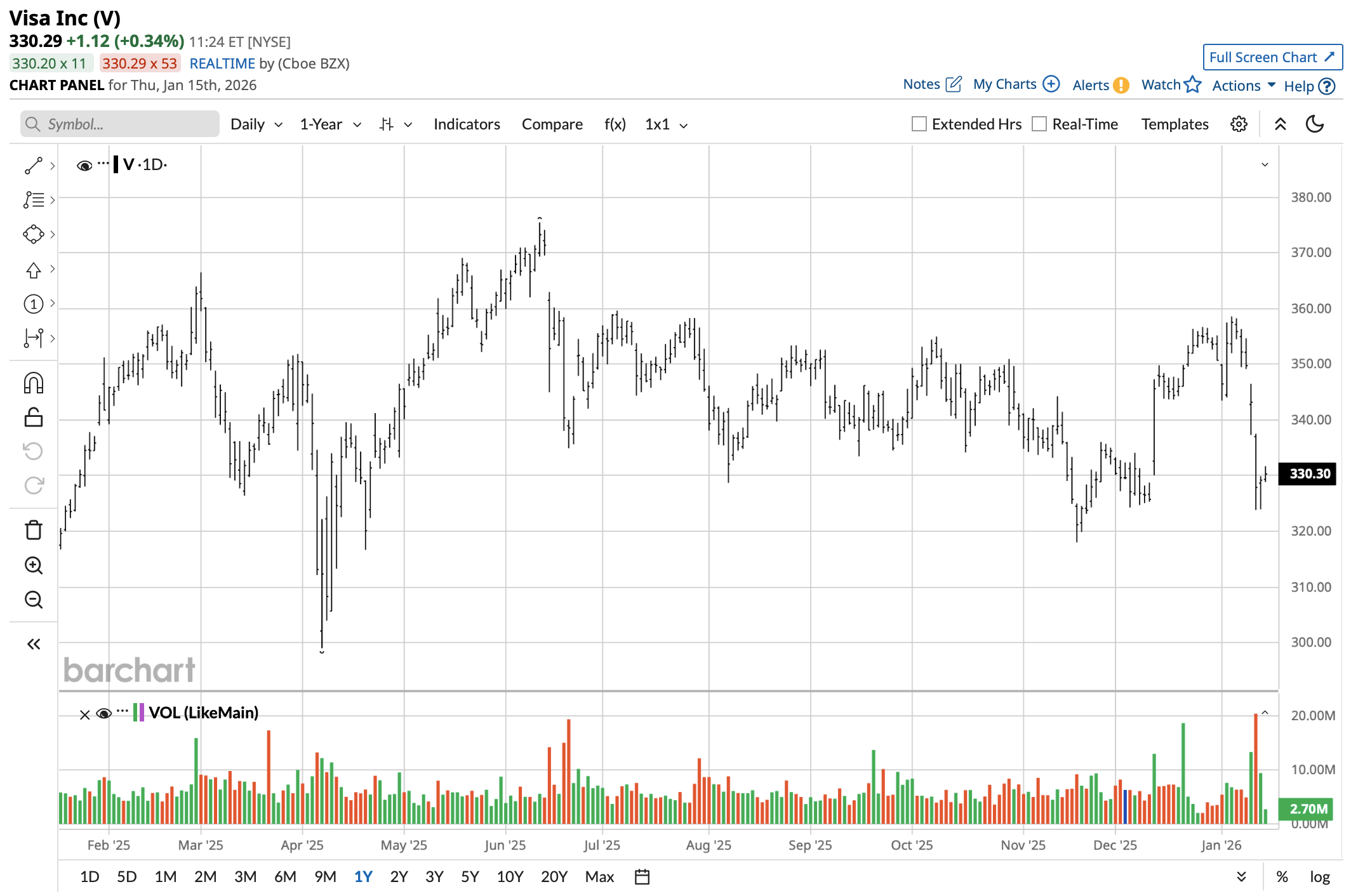 Over the past year, the price of V stock has ranged from a low of $299 to a high of $375, but shares are currently closer to the lower end of this range. The relative strength indicator is also below 40, indicating that there has been selling pressure in V stock. In comparison to Visa stock, the S&P 500 ($SPX) has fared relatively better, up 17% for the past 52 weeks versus Visa's 3% gain.