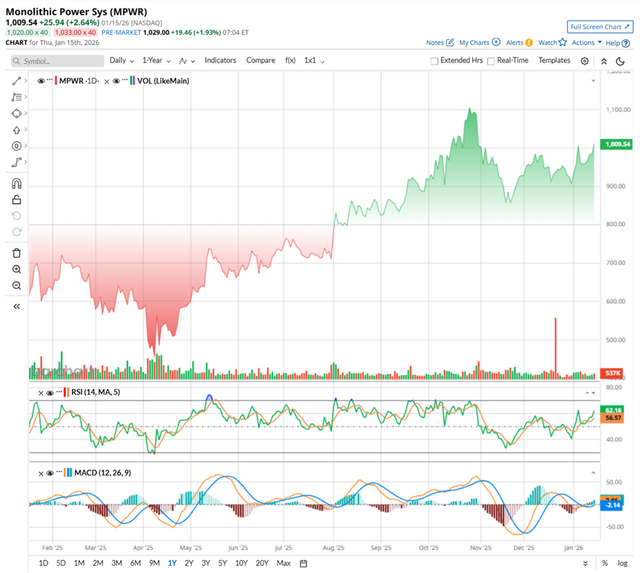 Momentum has remained strong over the past year. Shares gained 73% over the past 52 weeks, surging to an all-time high of $1,123.38 in October. While the AI megatrend has clearly amplified investor enthusiasm, Monolithic’s growth trajectory predates the current cycle, rooted in its expanding role across data centers, automotive, and industrial markets.