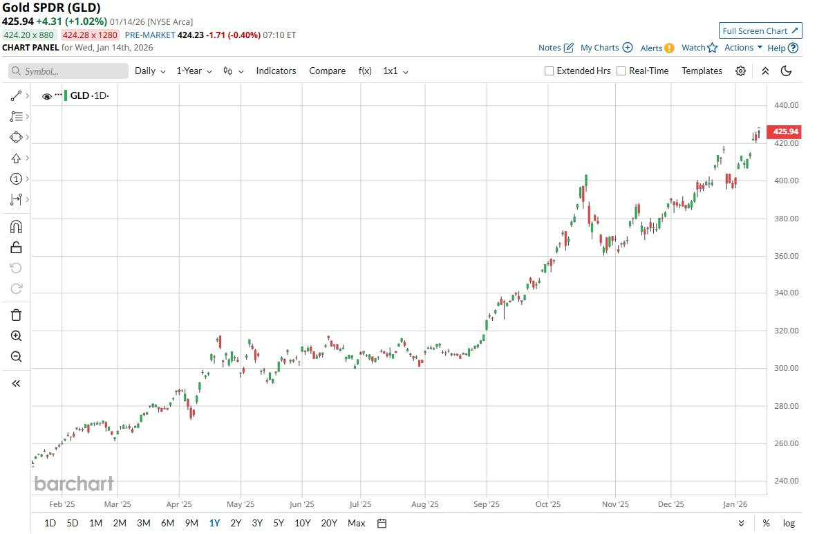 The scale and current numbers underline GLD's role in the market. This trust oversees about $159 billion in managed assets and charges a 0.40% management fee for that direct bullion exposure. GLD's recent price sits near $421, with a year-to-date (YTD) gain of 6% and a 52‑week return of 68%, with monthly volume around 13.8 million shares, closely tracking the latest surge in gold.