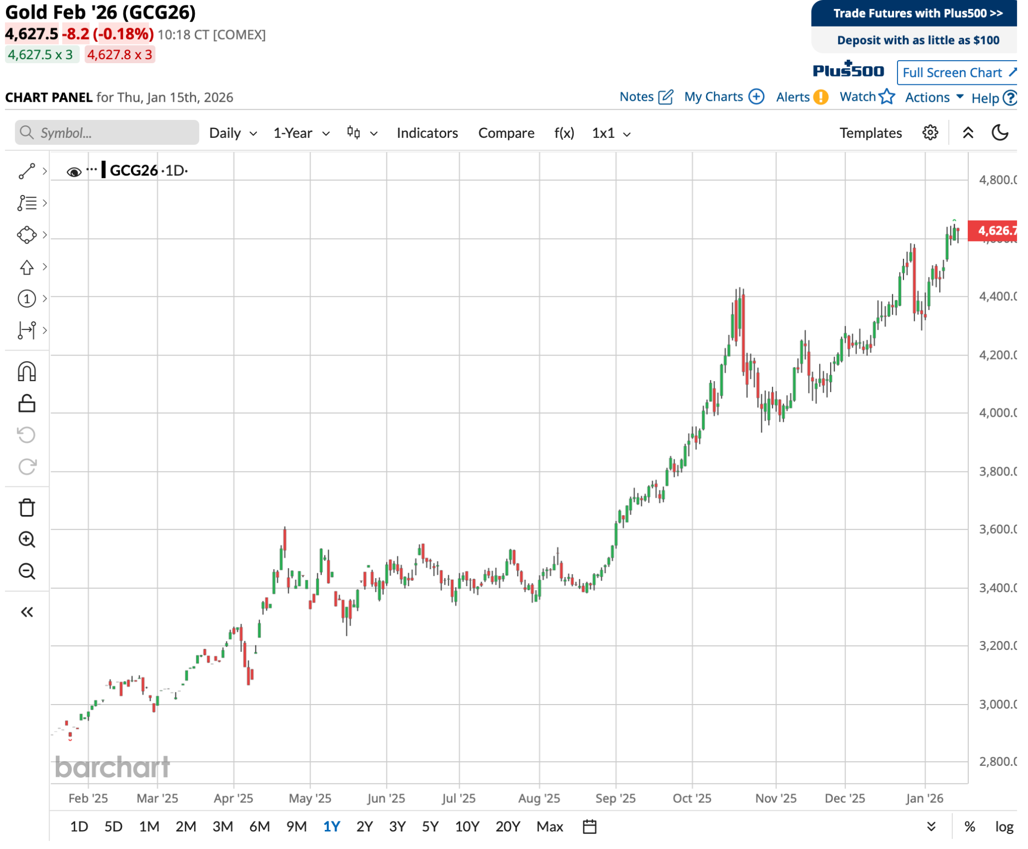 Gold is back on every screen again, and that is because record prices tend to concentrate attention. Futures tied to the main Gold COMEX contract (GCG26) are trading around the $4,600 mark after an extraordinary run in late 2025 and early 2026. Meanwhile, the broader precious metals sector just logged the strongest performance across the commodities complex last year.