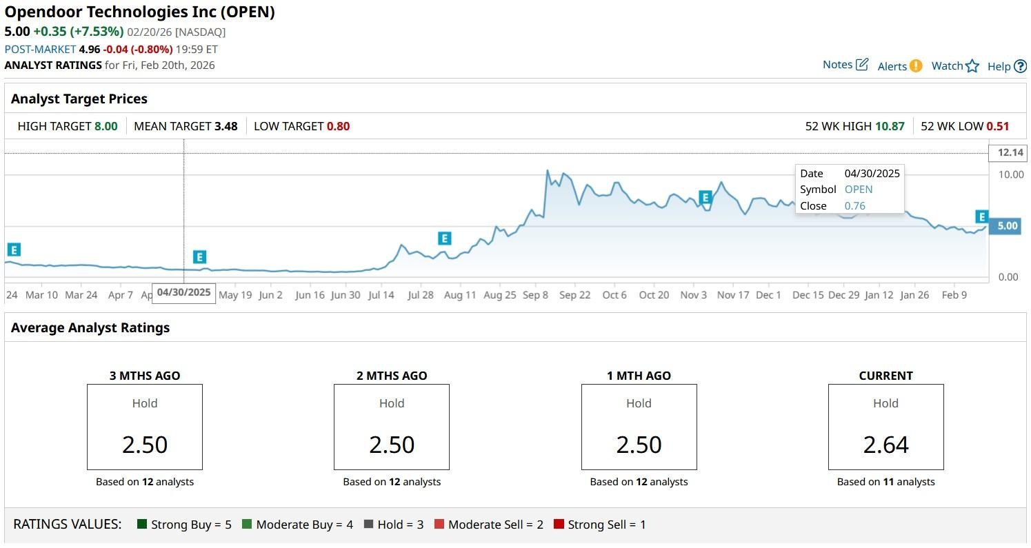 The consensus rating on Opendoor Technologies sits at “Hold” only, with the mean target of about $3.48 indicating potential downside roughly 30% from here.