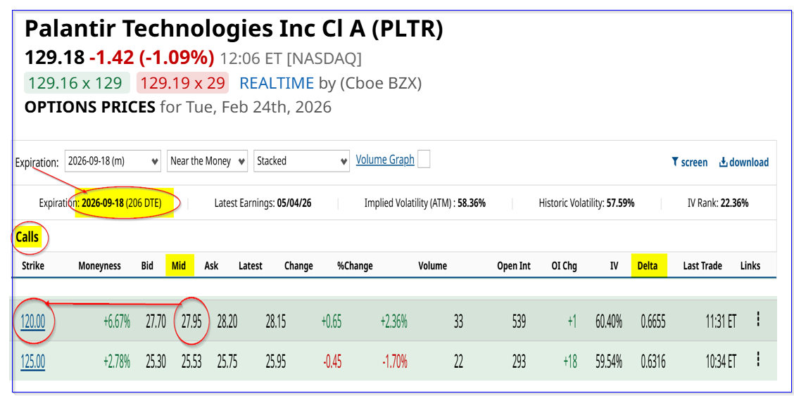 For example, the Sept. 18 call option, which is 206 days to expiry (DTE), at the $120.00 strike price has a midpoint premium of $27.95.