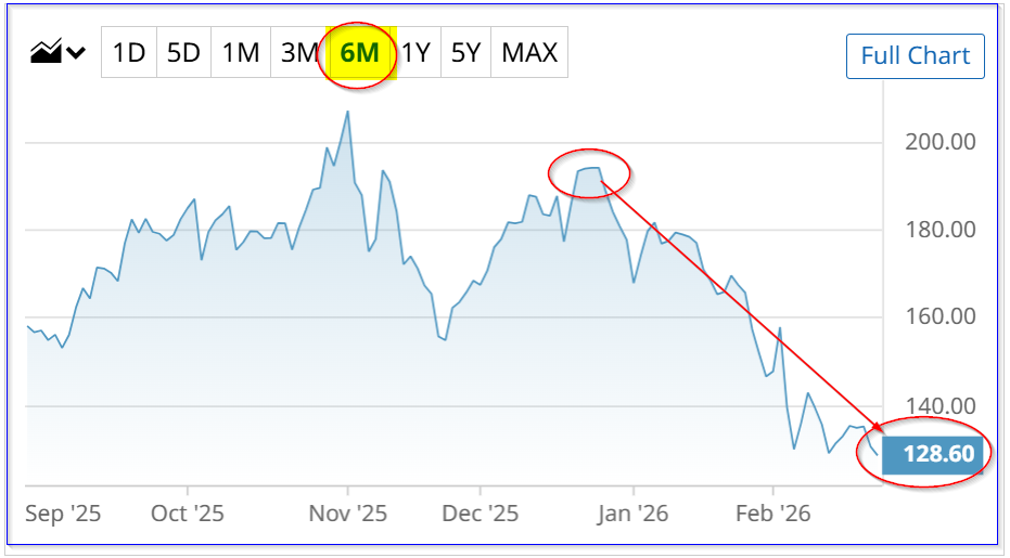PLTR is now down to $128.71 in midday trading on Feb. 24. It's down over $65 from $194.17 on Dec. 24, 2025, a 33% drop in 2 months. That provides a huge opportunity for value buyers.