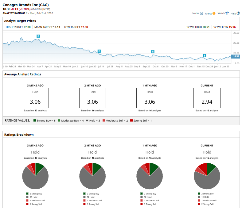 On January 16, Morgan Stanley analyst Megan Alexander Clapp cut her price target on Conagra Brands to $18 from $19 while maintaining an “Equal-Weight” rating, citing a difficult outlook for U.S. food stocks. She noted that industry conditions remain challenging, with intensifying competition driven by value-focused pricing, heavier promotions, and a resurgence in private-label brands expected to persist into 2026.