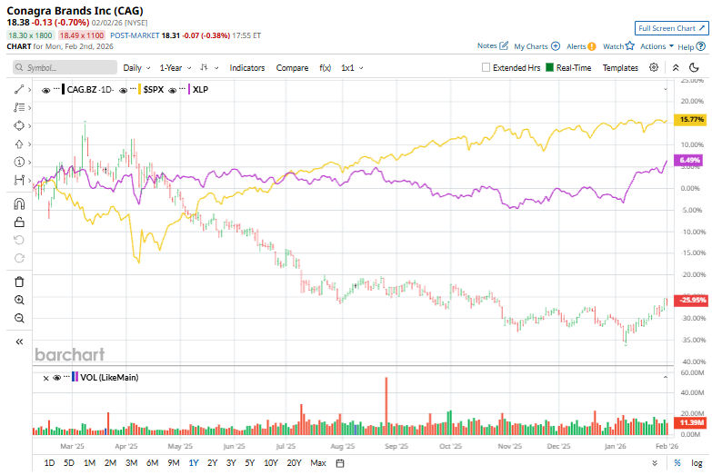 Narrowing the focus, shares of Conagra Brands have lagged behind the State Street Consumer Staples Select Sector SPDR Fund’s (XLP) 7% rise over the past 52 weeks and 8.8% return in 2026.