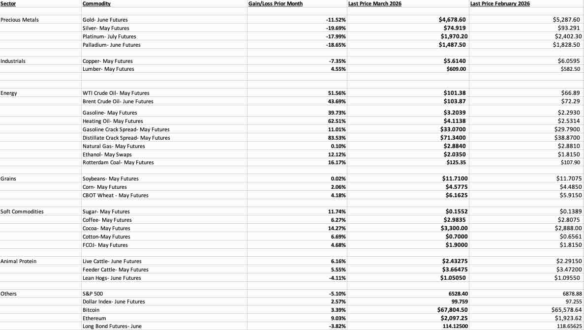 As commodities move into April, they enter spring. Seasonality favors some strength in grains, meats, and gasoline, and weakness in natural gas as the shoulder and U.S. inventory injection season begins. Expect volatility in gasoline prices during the driving season, but the Middle East will dictate the path of least resistance for prices. The 2026 grilling season is only two months away, which will likely support beef and pork prices. The situation in the Middle East remains the most significant factor for crude oil and oil product prices over the coming days and weeks.