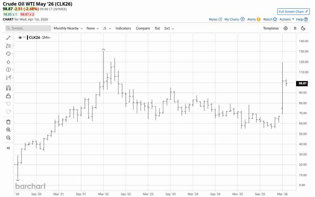 The monthly May NYMEX WTI crude oil futures chart shows that the price rose to $119.48 per barrel on March 9, and was 51.56% higher in March. Brent crude oil posted a 43.69% monthly gain.
