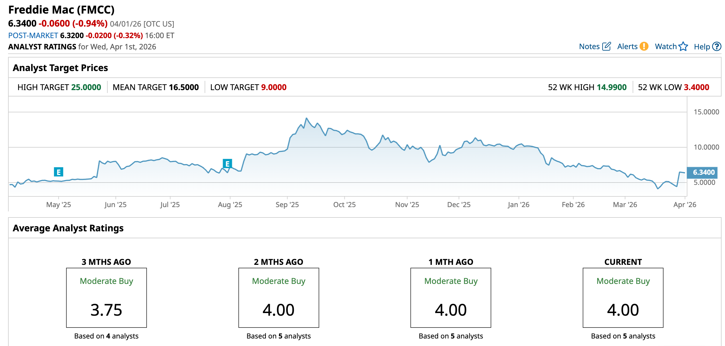 Overall, the stock is now up 11% over the past year. However, from its 52-week high of $14.99 in September 2025, FMCC is still down 57.7%, with the stock recently touching a 52-week low of $3.40 on March 19.
