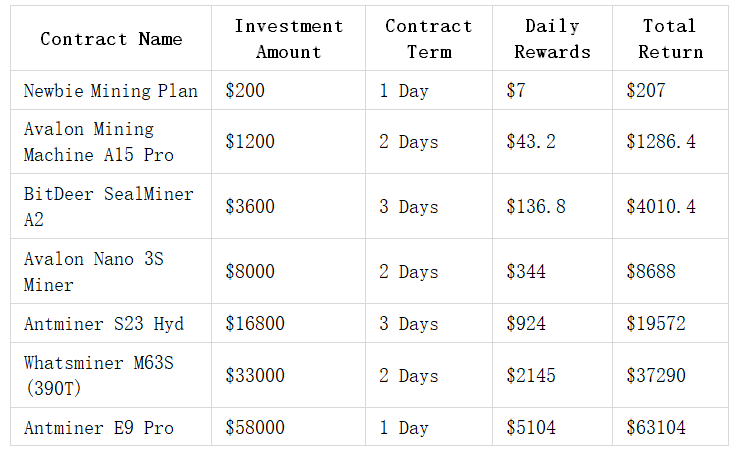 Hashbitcoin offers a variety of flexible mining contracts designed to cater to different investment needs. All contracts are short-term, with daily payouts and principal returns. Below are some of the popular mining plans available: