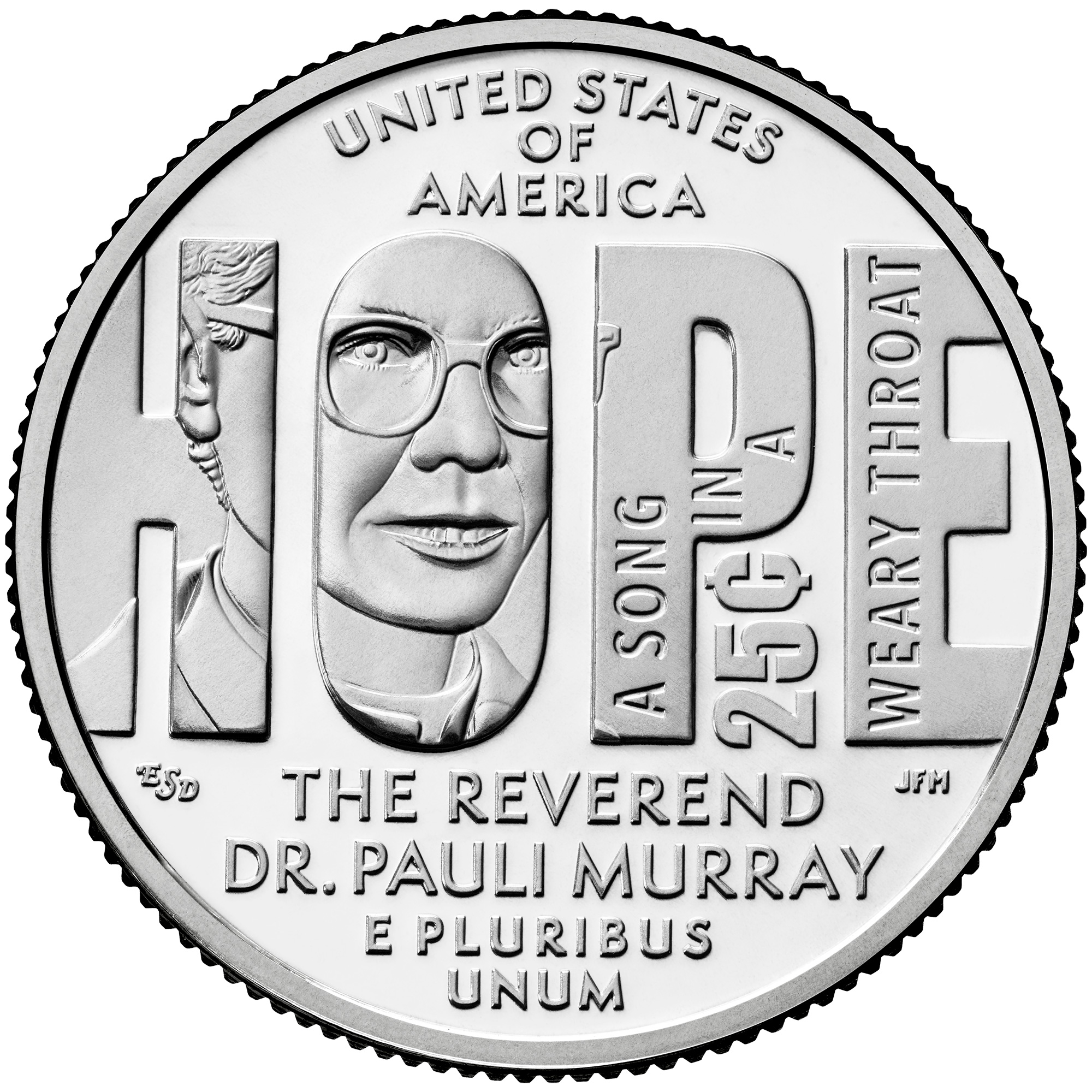 The reverse (tails) depicts Reverend Dr. Pauli Murray’s eyeglass-framed face within the shape of the word “HOPE,” which is symbolic of Murray’s belief that significant societal reforms were possible when rooted in hope. A line from her poem “Dark Testament” characterizes hope as “A SONG IN A WEARY THROAT,” an inscription in the design.