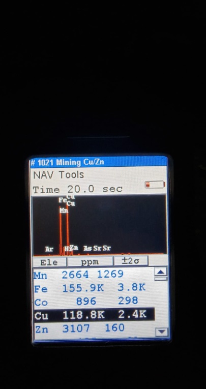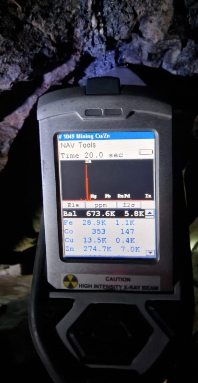 Figure 2: Screenshots of hand-held XRF-measurements from base metal mineralization on the walls of the Cu-Zn-Pb-Ag mineralized zone in G4. Grades are in ppm, which translates into 1.25 % Cu, 27.47 % Zn (left), 11.88 % Cu, 0.31 % Zn (middle), and 0.28 % Cu, 9.52 % Zn (right). Mineralization is accompanied by anomalous cobalt grades of 0.03-0.09 %.