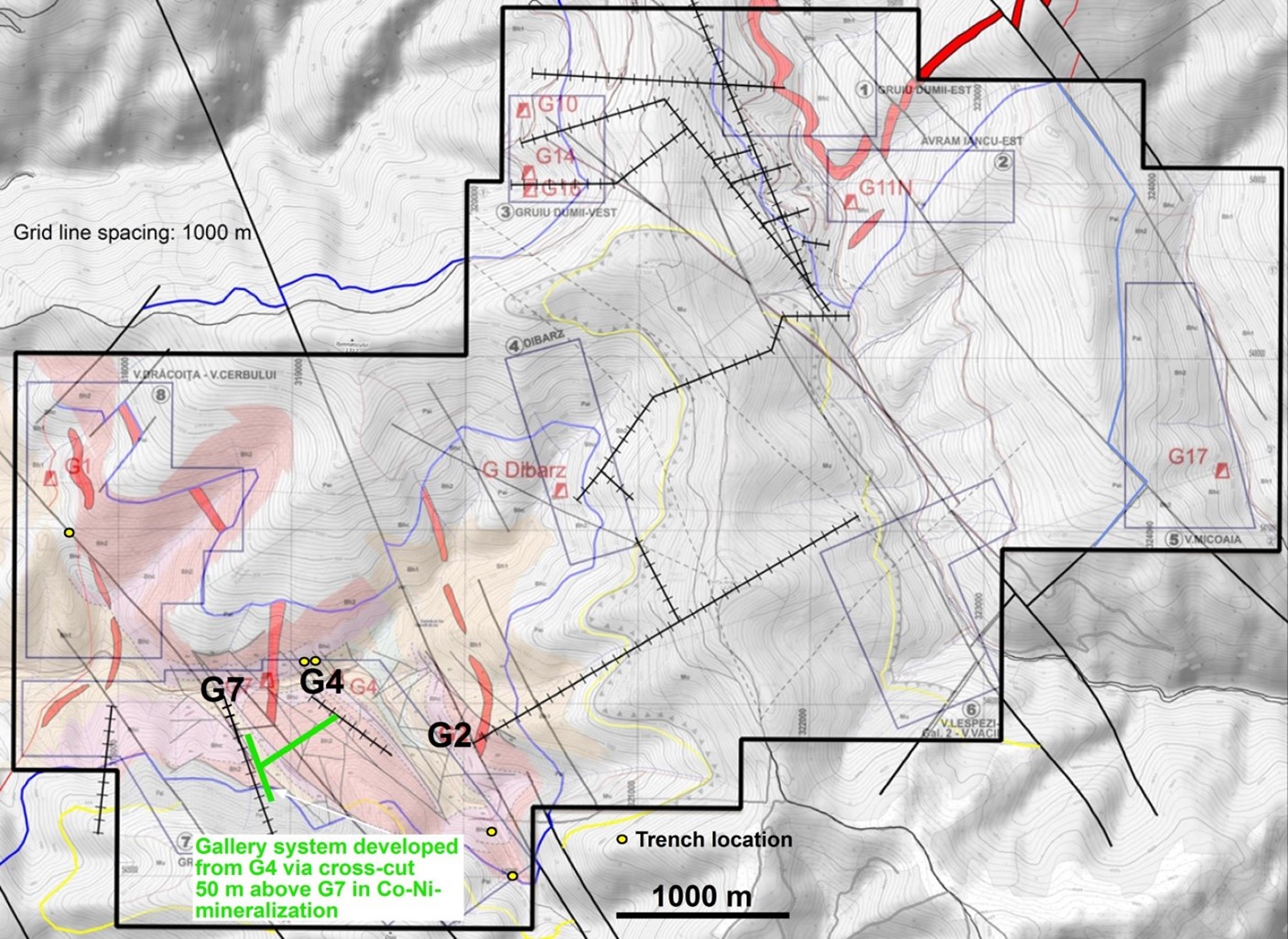 Figure 1: License overview map showing the principal gallery locations; those recently reopened are highlighted in black (G2, G4, G7). G4 lies topographically 50 m above G7, and the cross-cut driven towards G7 (shown in green) intersects the Co-Ni-mineralized system at a 50 m higher level than previously identified in G7. G4 is developed in base metal mineralization, featuring zones of Cu-Zn-Pb-Ag, which will also be subject to investigation.
