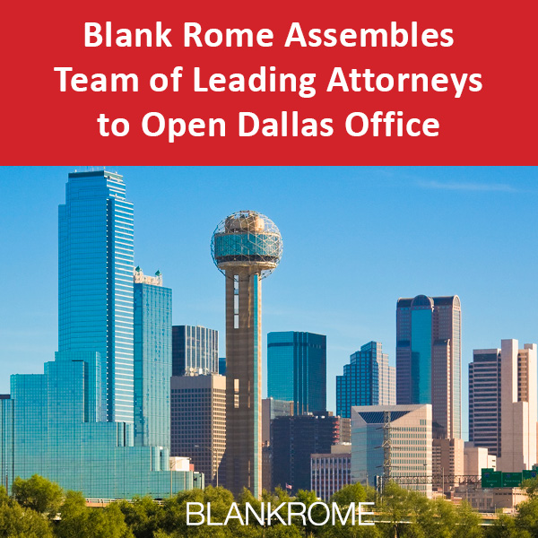 “Dallas is a vibrant and thriving business community and we are thrilled to open an office here and bring together such an outstanding group of attorneys to launch our efforts,” said Grant Palmer, Blank Rome’s Chair and Managing Partner. “Establishing an office in Dallas has been a strategic priority of our firm for some time to better serve our clients who are based in or do business in Dallas and North Texas. We have been committed to entering the market with a team of leading corporate, real estate, and finance attorneys who not only have exceptional experience and reputations locally and nationally, but also fit together as a cohesive and collaborative team. We are excited about Blank Rome’s future in Dallas with our new colleagues and are looking forward to continued growth.”