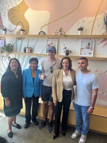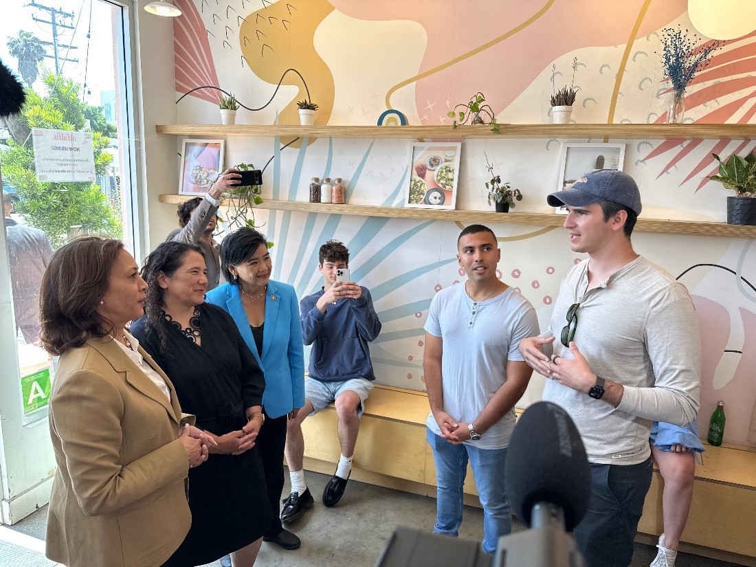While in Santa Monica, they toured Alfalfa Santa Monica LLC, a health-conscious, Latino-owned restaurant that benefitted from a Community Advantage loan. During the visit, Vice President Harris, Administrator Guzman, and Representative Chu met with the owners to discuss how Alfalfa Santa Monica was able to successfully use the SBA’s Community Advantage Program to help them expand from their New Jersey home and continue to provide healthy food options to communities. They also received assistance from other SBA programs, including the American Rescue Plan’s Restaurant Revitalization Fund.