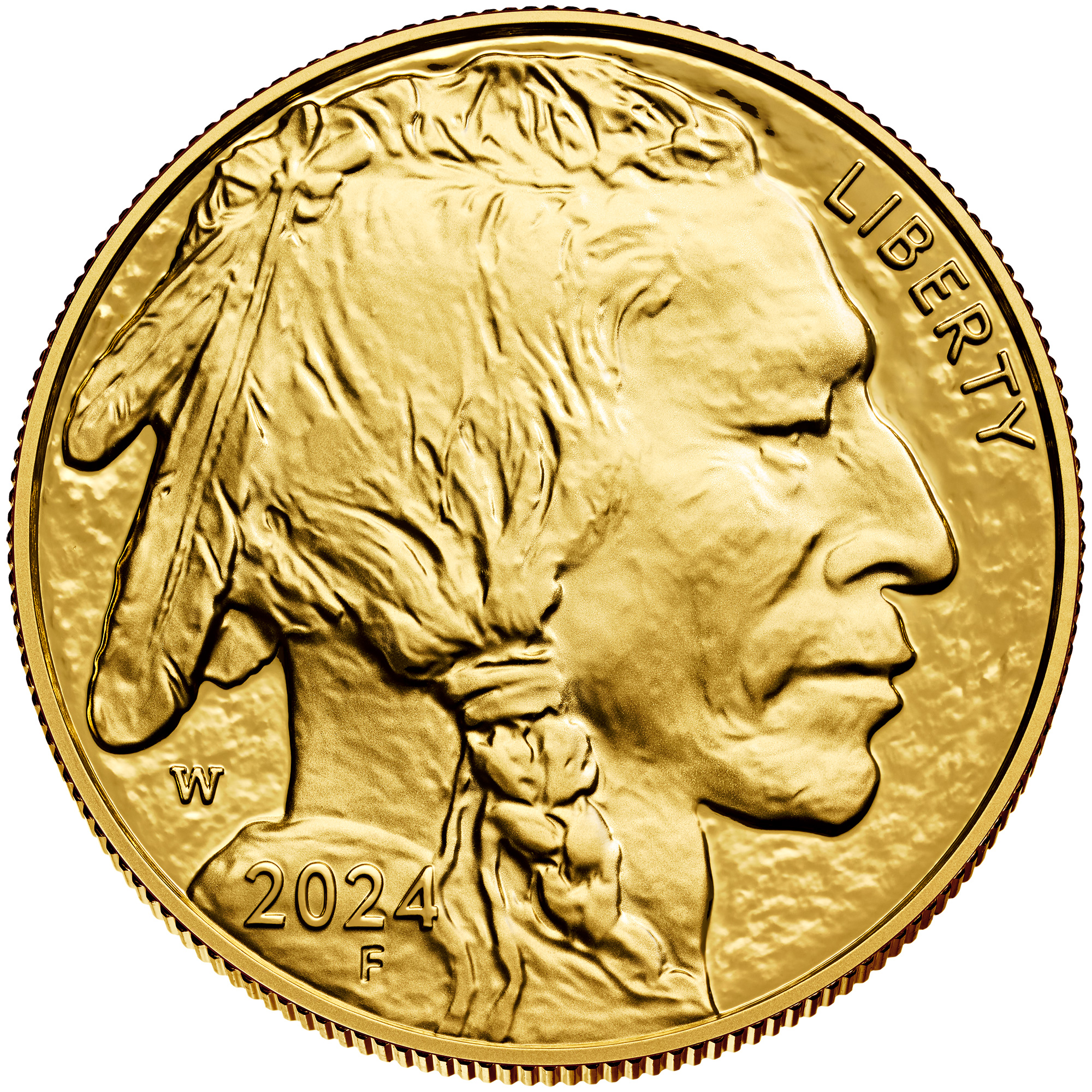 The Mint launched the American Buffalo Coin Program in 2006. The one-ounce coin in this program is the first 24-karat gold proof coin ever struck by the Mint and is the collector version of the official United States Mint American Buffalo One Ounce Gold Bullion Coin. Designs depicted on this coin are based on the 1913 Type I Buffalo nickel by sculptor James Earle Fraser. The obverse (head) portrays a profile representation of a Native American with the inscriptions “LIBERTY” and “2024.” The reverse (tail) features an American Buffalo (also known as a bison) and the inscriptions “UNITED STATES OF AMERICA,” “E PLURIBUS UNUM,” “IN GOD WE TRUST,” “$50,” “1 OZ.,” and “.9999 FINE GOLD.”