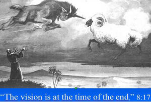 "Daniel's vision for our time may be seen as a conflict between a militant ram pushing from the Middle East that angers a goat. It flies from the west to break the ram's horns (militancy). The horns represent the kings of Media and Persia—areas that are now Iraq and Iran, Daniel 8:7,17,20.