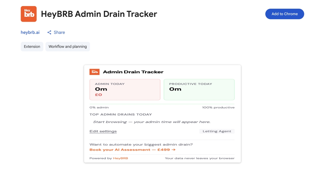 LONDON - HeyBRB, the AI automation consultancy for UK small business owners, today launched the HeyBRB Admin Drain Tracker: a free Chrome extension that runs silently in the background and tells letting agents, accountants, and tradespeople exactly how much admin is eating their week — not in vague percentages, but in pounds.