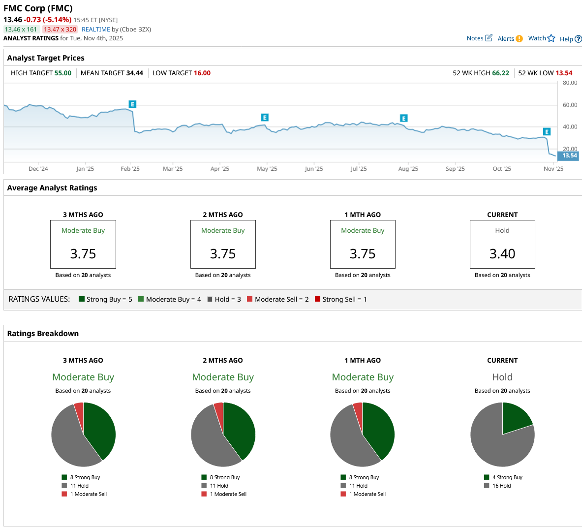 As expected, several Wall Street analysts drastically lowered FMC’s target price following the Q3 earnings last week. For instance, Citigroup slashed its target price by half to $17, while Goldman Sachs lowered its from $43 to $19. UBS and Wells Fargo also lowered their target prices by over 50% to $17 and $16, respectively.