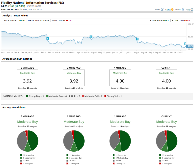 Among the 27 analysts covering FIS stock, the consensus is a “Moderate Buy.” That’s based on 13 “Strong Buy” ratings, three “Moderate Buys,” ten “Holds,” and one “Strong Sell.”
