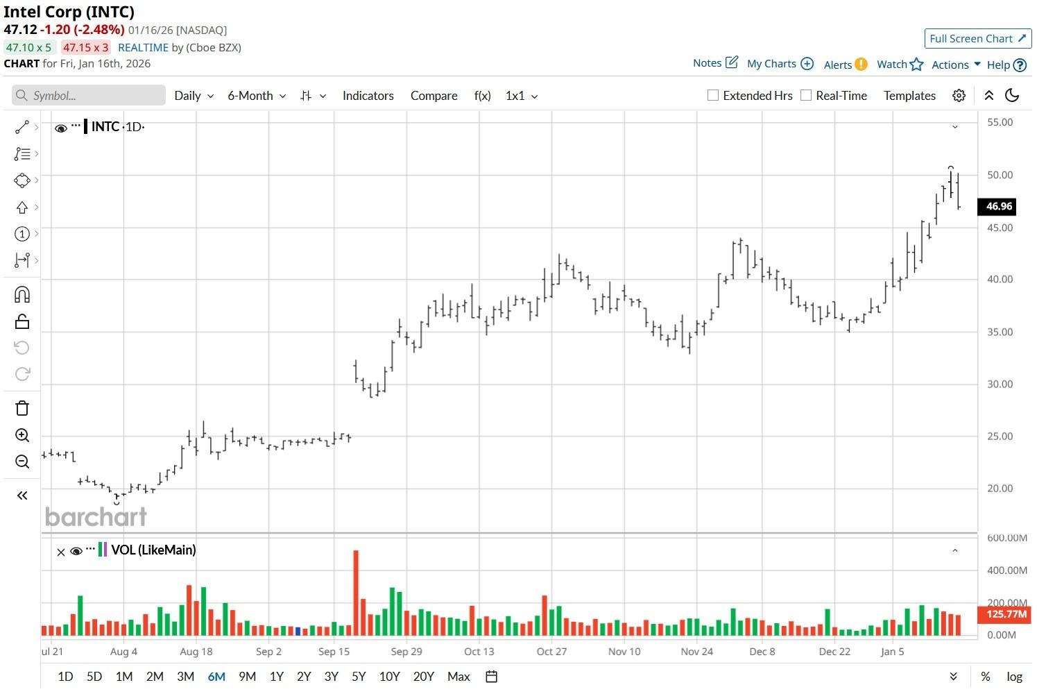 For Intel shares, options data is largely skewed to the upside as well. Derivatives contracts expiring mid-April currently have the upper price set at about $56, according to Barchart.