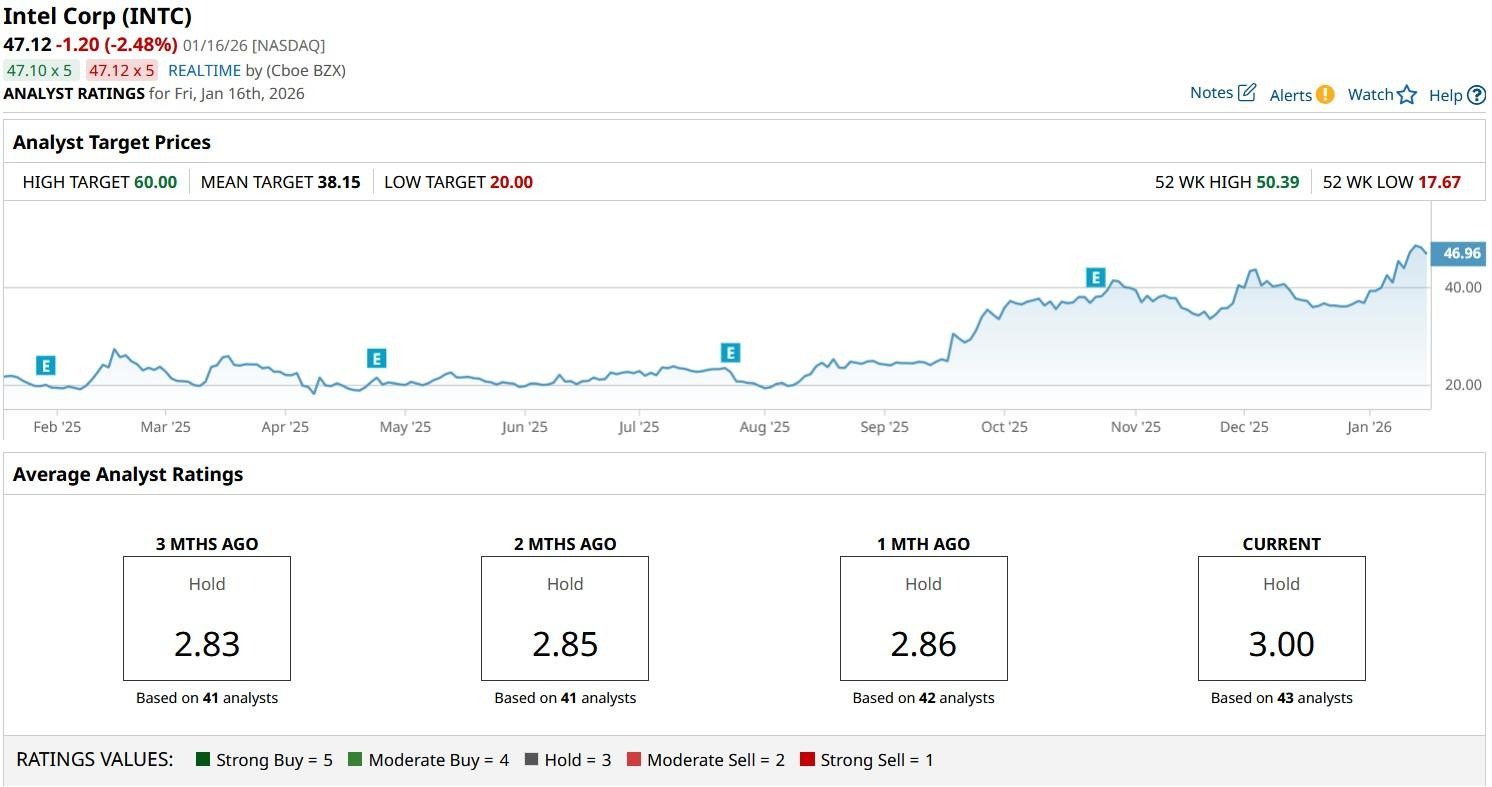 The consensus rating on Intel stock sits at “Hold” only, but price objectives currently go as high as $60, indicating potential upside of roughly 30% from here.