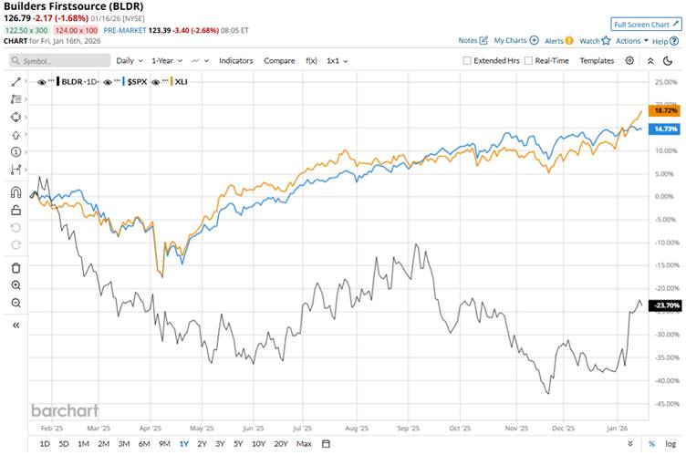 BLDR faced pressure through much of 2025 largely due to soft housing market conditions, weaker sales and margin compression, which weighed on investor confidence. However, into 2026, the stock has been rising on renewed optimism, partly fueled by better housing data and sector sentiment that lifted homebuilder and building-materials stocks as investors anticipate potential policy support (like interest-rate easing) and potential stabilization in housing starts.
