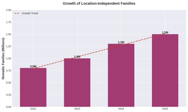 Digital nomad families are exploding in number. As of 2025, an estimated 35 million people worldwide identify as digital nomads, with projections suggesting hundreds of millions by 2030. Approximately 1.5 million nomadic families now travel full-time, relying on virtual schooling to maintain educational continuity.