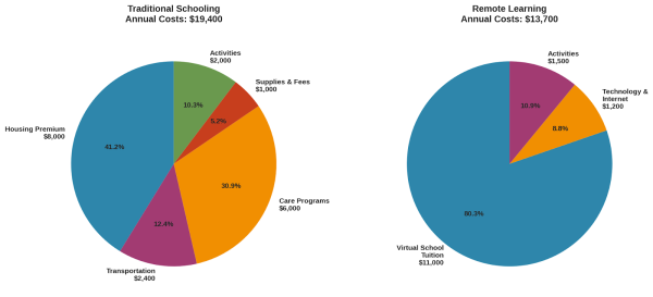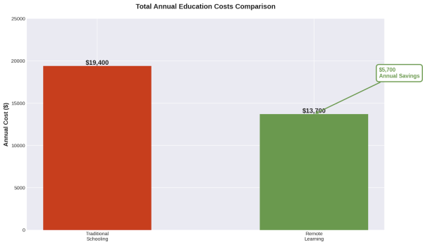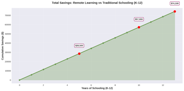 The remote learning family saves $5,700 annually. Over 13 years of schooling (grades K-12), that's $74,100 in direct savings. Factor in investment returns if that money gets saved or invested, and the total exceeds $100,000.