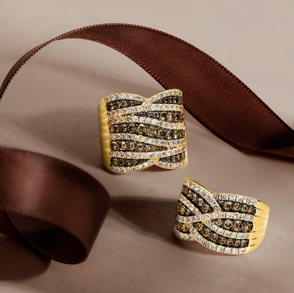 • Wrapped in Chocolate™ is the exclusive new iteration of Le Vian’s Chocolate Shavings™ collection. Fresh, light and tactile designs, created to entice the senses, see swirling ribbons of Chocolate Diamonds® and Nude Diamonds™ twist and wrap around gleaming polished Honey Gold™.