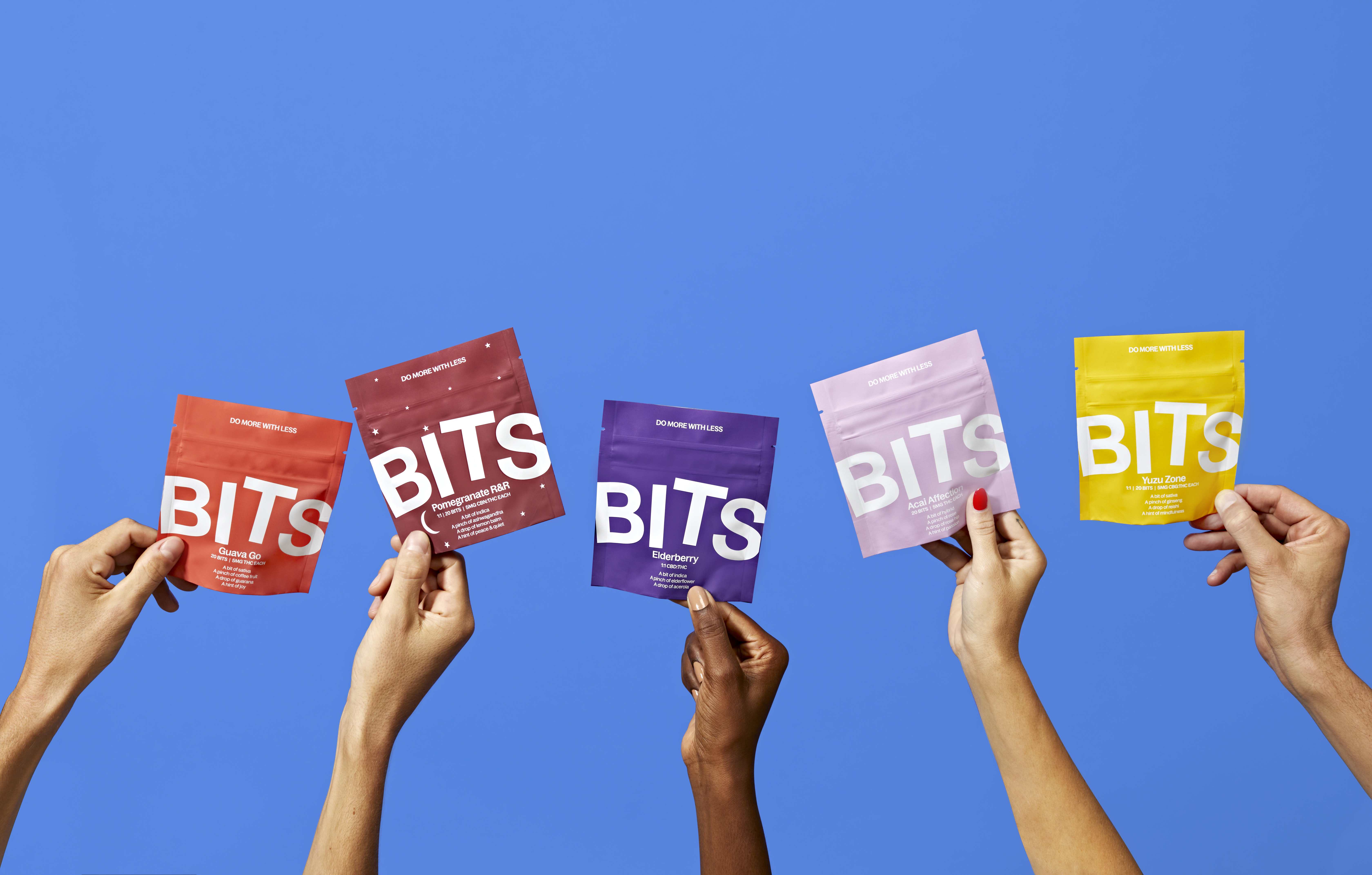 - BITS™ pectin-based gummies combine tailored cannabinoid ratios and adaptogens for versatility in enhancing an array of everyday use-cases: Acai Affection, Pomegranate R&R, Elderberry Wellness, Guava Go, and Yuzu Zone
