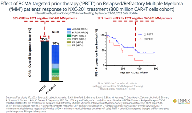 LOS ANGELES, Oct. 02, 2023 (GLOBE NEWSWIRE) -- Immix Biopharma Inc. (Nasdaq: IMMX) (“ImmixBio”, “Company”, “We” or “Us”) today announced the presentation of updated data from the ongoing Phase 1b/2 NEXICART-1 (NCT04720313) study of its novel, autologous, BCMA-targeted chimeric antigen receptor T (CAR-T) cell therapy NXC-201. The updated dataset consists of 63 multiple myeloma patients (including data on 13 new patients and continued follow-up data on 50 previously enrolled patients), at a poster presentation at the 20th International Myeloma Society Annual Meeting in Athens, Greece on September 27-30, 2023 (72 patient count includes 9 AL Amyloidosis patients which will be announced separately).