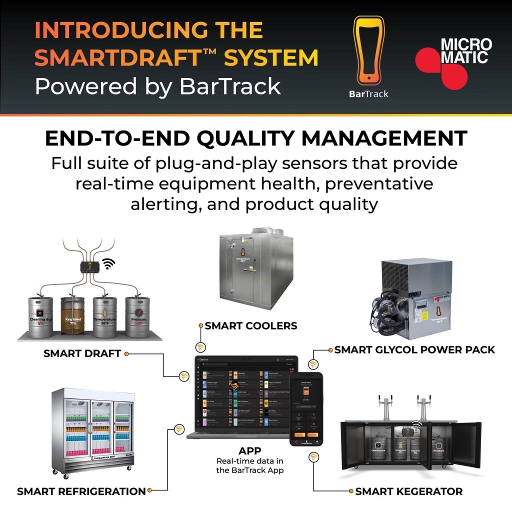 The SmartDraft™ System, powered by BarTrack, is a combination of IOT offerings that monitor and report on all of the variables that affect beverage quality and profitability, including draft line and cooler temperature, pressure, line cleanliness, foam, unrung pours, keg levels, and system health. The SmartGlycol System, SmartRefrigeration, and BarTrack’s Smart Beverage Sensors combine to create the first vertically integrated SmartDraft™ System. BarTrack’s non-intrusive technology doesn't have any moving parts, which allows bar owners and servicers that use Micro Matic equipment to have access to reliable and precise data from the tip of their fingers. The integrated BarTrack App connects to the smart system and point-of-sale tools to provide teams with access to data on every pour as it moves through the system to the consumer’s glass. Nobody likes a foamy, flat, or over carbonated beer. BarTrack and Micro Matic are teaming up to help end the unmonitored, subpar drinking experience.
