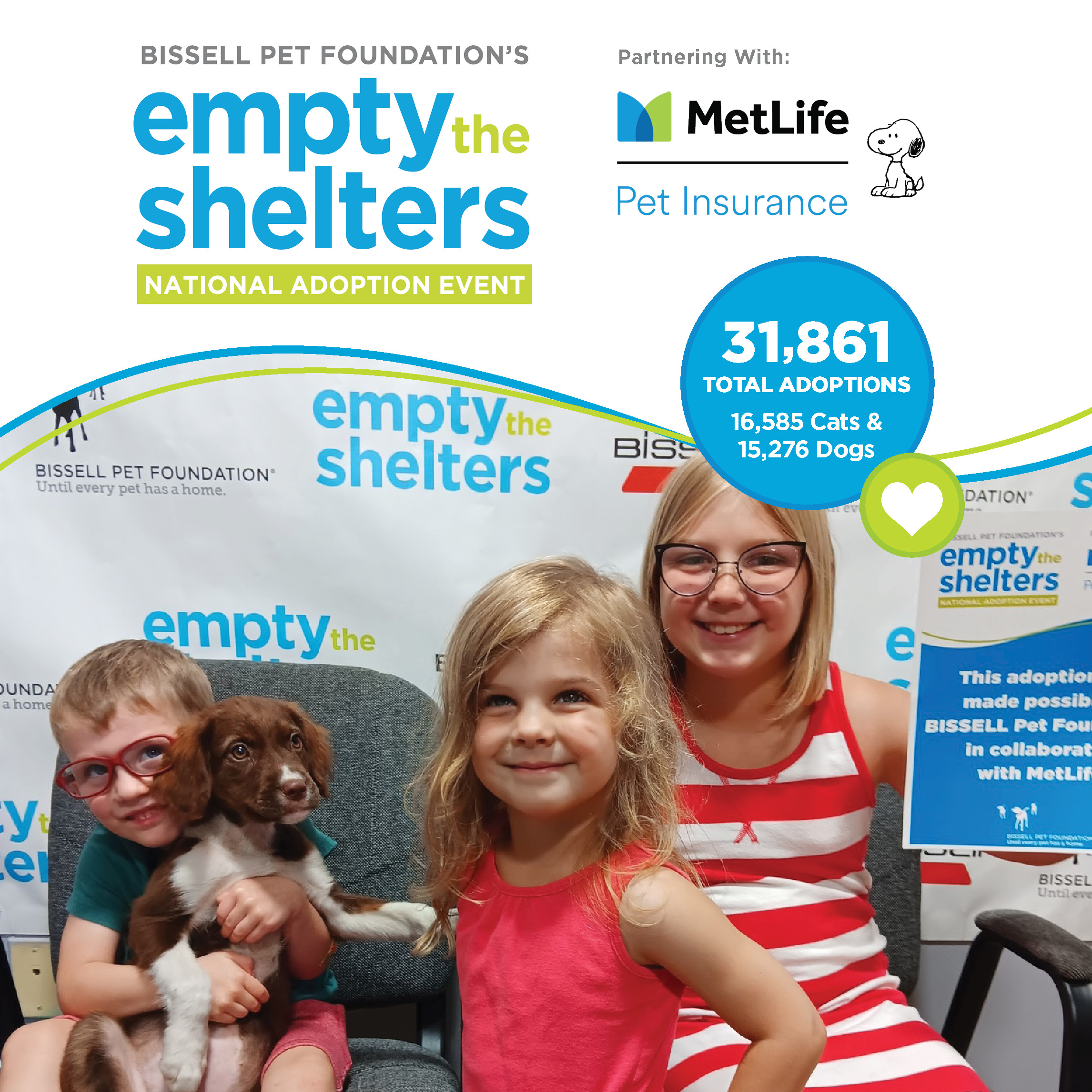Grand Rapids, MI, Aug. 07, 2023 (GLOBE NEWSWIRE) -- Nearly 32,000 pets were adopted during the nation’s largest funded adoption event, BISSELL Pet Foundation’s “Empty the Shelters.” The Foundation partnered with MetLife Pet Insurance to raise awareness for deserving shelter pets by sponsoring reduced adoption fees at 335 shelters in 44 states.