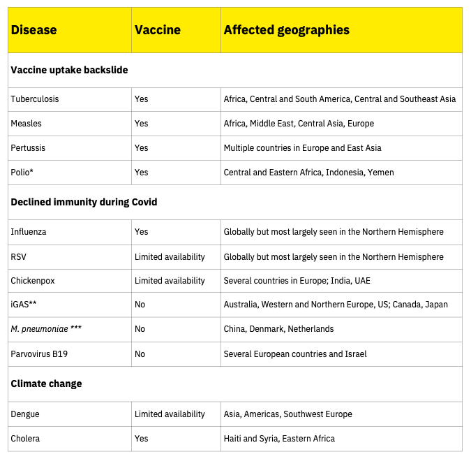 New analysis by Airfinity and Bloomberg News reveals outbreaks of diseases such as measles, whooping cough, tuberculosis and polio, as well as dengue and cholera are surging worldwide.