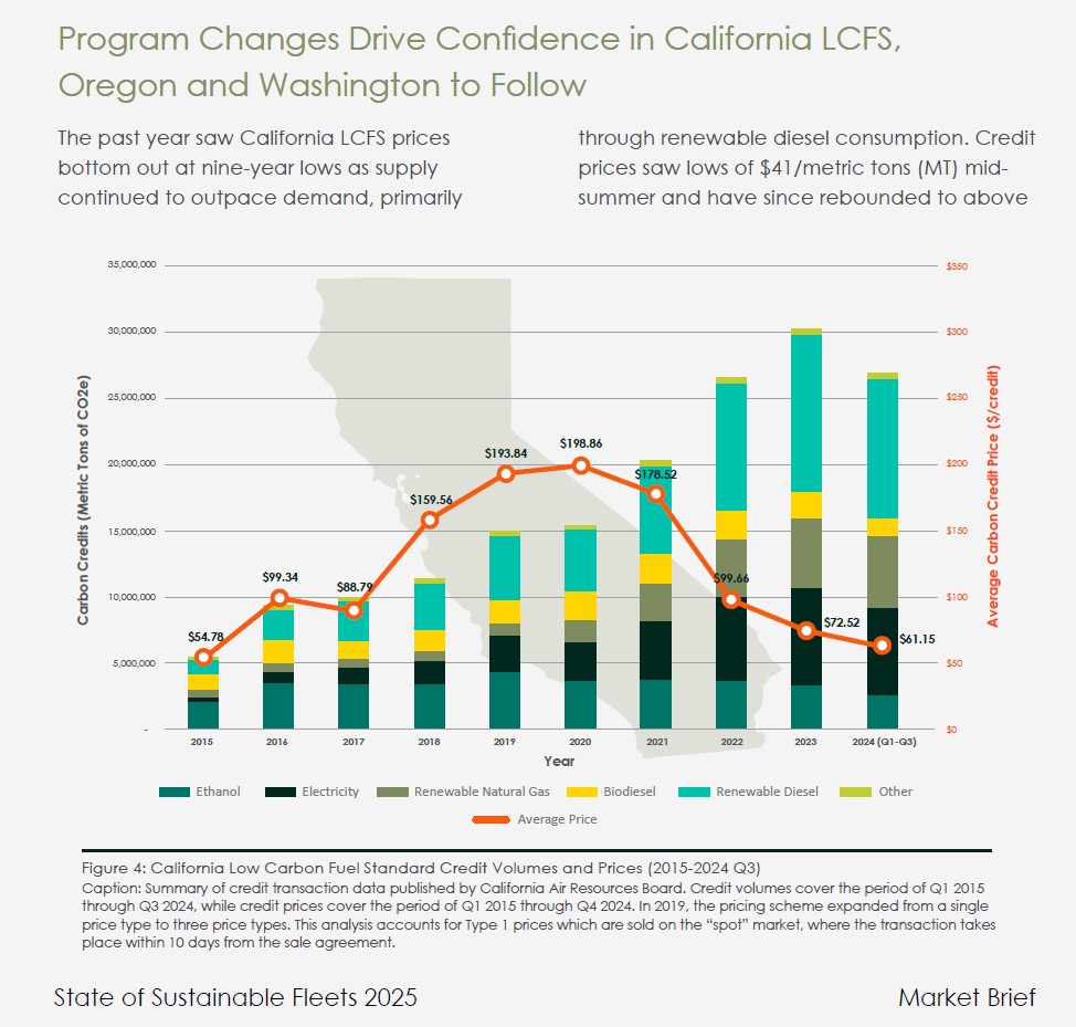 - Chart from the 2025 State of Sustainable Fleets Market Brief summarizes the LCFS credit market